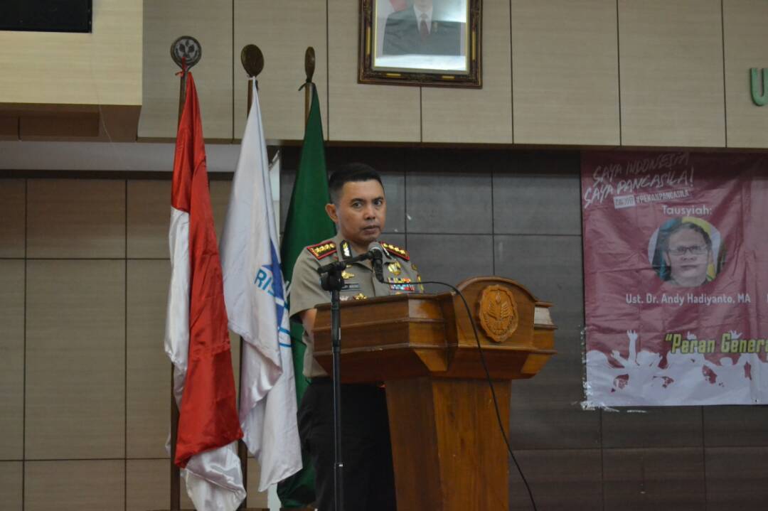 | Kombes Pol DR (C) Andry Wibowo, SIK, MH, MSI sedang menceritakan bahwa dirinya pernah menjadi tim negosiator untuk menangani Gerakan Aceh Merdeka. |