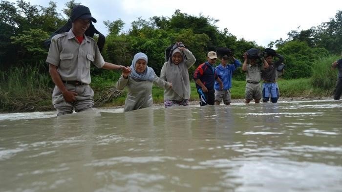 Karena jarak sekolah yang jauh, para guru rela untuk menyebrangi sungai meskipun sudah berpakaian rapi. Menyebrangi sungai adalah jalan satu-satunya menuju ke sekolah karena tidak ada perahu maupun jembatan.