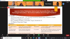Lalu, dilanjut dengan penyampaian laporan kegiatan oleh ketua pelaksana, yaitu Ibu Susan Febriantina. Pada pidatonya, beliau mengatakan bahwa acara ini terdiri dari tiga rangkaian kegiatan, yaitu yang pertama adalah tadarus Quran khusus internal Fakultas Ekonomi UNJ yang terdiri atas dosen, tenaga kependidikan, dan mahasiswa FE UNJ dengan total peserta sebanyak 105 orang. Selanjutnya, Ibu Susan menyampaikan santunan anak yatim dan duafa dengan total donatur sebanyak 80 orang meliputi dosen, tenaga kependidikan, mahasiswa, alumni, dan donatur eksternal. Total sumbangan hingga saat ini sebesar Rp46.561.100,00 Kegiatan ini bekerja sama dengan LAZ Zakat dan telah sukses dalam pendistribusiannya kepada 230 anak yatim dan duafa. Kegiatan puncaknya adalah tablig akbar yang diselenggarakan dini hari dengan total peserta yang hadir pada Zoom Meeting sebanyak 255 orang. Setelah pelaporan kegiatan, dilanjut dengan pemutaran video yang menampilkan kegiatan santunan anak yatim dan duafa oleh panitia.
