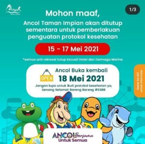 “Mohon maaf, Ancol taman impian akan ditutup sementara untuk pemberlakuan penguatan protokol kesehatan dari tanggal 15—17 Mei 2021. Semua unit rekreasi ditutup kecuali Hotel dan Dermaga Marina. Ancol buka kembali pada tanggal 18 Mei 2021. Jangan lupa ikuti protokol kesehatan ya, Senang Selamat Bareng Bareng #SSBB,” Kutipan dari laman Instagram @ancoltamanimpian.