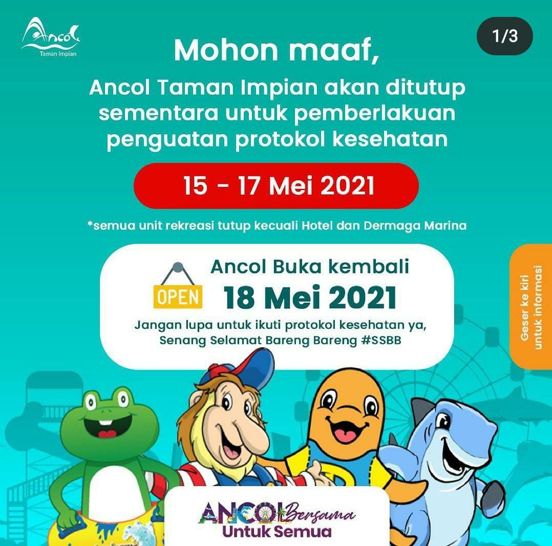 “Mohon maaf, Ancol taman impian akan ditutup sementara untuk pemberlakuan penguatan protokol kesehatan dari tanggal 15—17 Mei 2021. Semua unit rekreasi ditutup kecuali Hotel dan Dermaga Marina. Ancol buka kembali pada tanggal 18 Mei 2021. Jangan lupa ikuti protokol kesehatan ya, Senang Selamat Bareng Bareng #SSBB,” Kutipan dari laman Instagram @ancoltamanimpian.