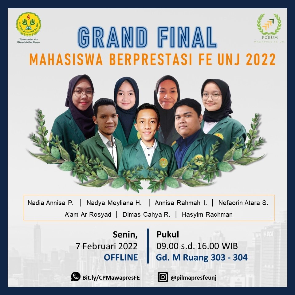 Grand Final pemilihan Mahasiswa Berprestasi Fakultas Ekonomi Universitas Negeri Jakarta kembali digelar. Acara ini berlangsung pada tanggal 7 Januari 2022 tepatnya di Gedung M Kampus A Universitas Negeri Jakarta dan diikuti oleh tujuh finalis dari lima program studi, yaitu: