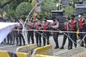 Masa aksi ini terlihat mulai berjalan ke arah Istana Merdeka. Namun, masa aksi ini kembali tertahan di samping Patung Arjuna Wijaya. Aparat keamanan terlihat sudah memblokir jalan dengan kawat berduri. Di bawah jembatan penyebrangan depan gedung Sapta Pesona, polisi terlihat sudah membentuk barisan untuk mengamankan masa aksi. Dari atas mobil komando, perwakilan mahasiswa mengingatkan untuk tidak bertindak anarkis dengan merusak pembatas yang ada.