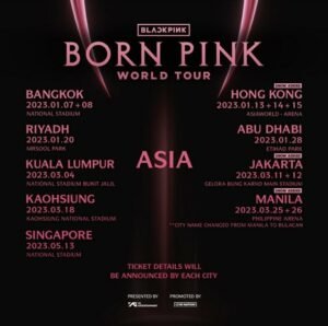 Grup K-pop wanita asal Korea Selatan, yaitu BLACKPINK yang beranggotakan Lisa, Jennie, Jisoo, dan Rosé resmi mengumumkan tanggal serta lokasi tur dunianya yang bertajuk Born Pink World Tour untuk kawasan Asia, termasuk Indonesia. Namun, dapat dipastikan konser tersebut terancam batal digelar di Stadion Utama Gelora Bung Karno (GBK), Senayan, pada Maret 2023 mendatang.