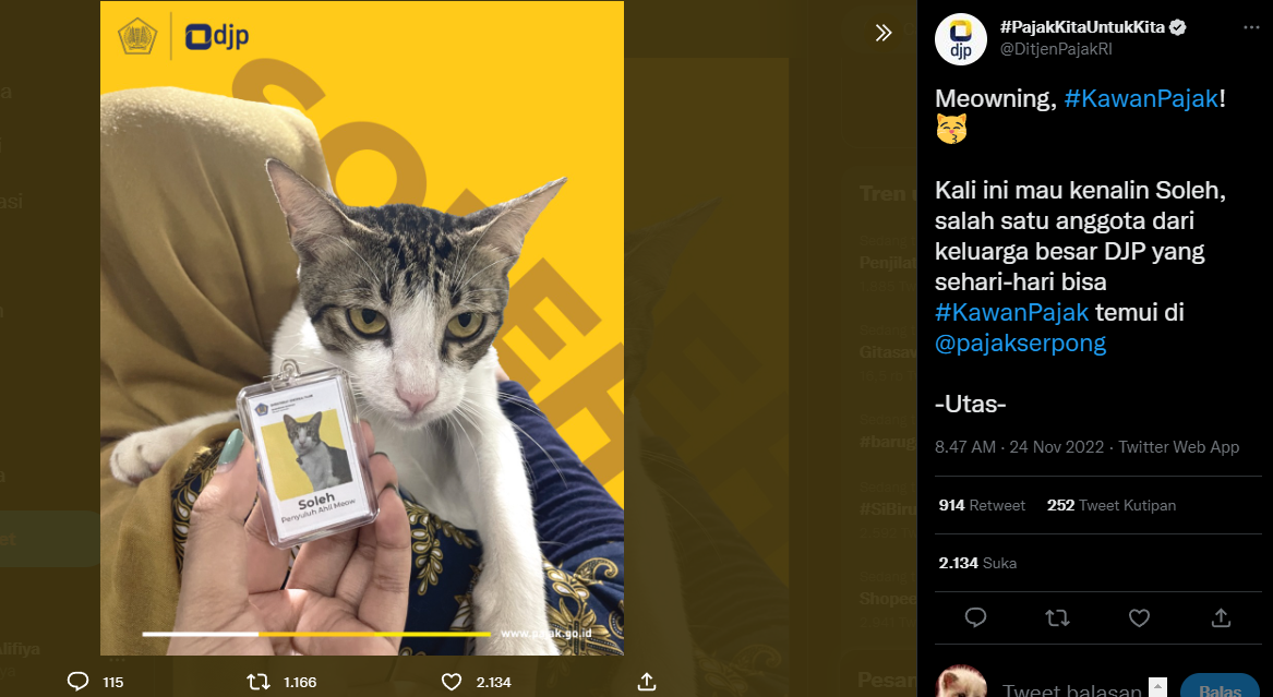 Baru-baru ini, Direktorat Jendral Pajak memperkenalkan salah satu pegawai barunya, uniknya pegawai kali ini bukanlah seorang manusia melainkan kucing bernama Soleh. Soleh merupakan seekor kucing lokal berawarna putih dan hitam. Soleh menjadi pegawai Ditjen Pajak wilayah Serpong, Tangerang Selatan (Tangsel) dan diberi tanda pengenal seperti pegawai Kemenkeu pada umumnya.