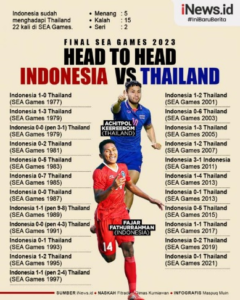 Pasukan Garuda Muda di bawah arahan Indra Sjafri ditargetkan mengulangi kejayaan sepak bola Indonesia yang sudah tiga dekade terakhir gagal mendulang emas. Duel Indonesia vs Thailand jilid keempat akan digelar di Stadion Olimpiade, Phnom Penh, Selasa (16/5/2023) pukul 19.30 WIB. Adapun, Vietnam dan Myanmar akan bertanding pada perebutan medali perunggu.