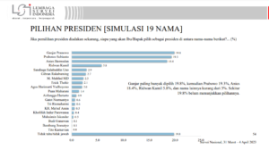 Berdasarkan hasil survei dari Lembaga Survei Indonesia (LSI) pada 31 Maret- 4 April 2023 dengan simulasi 19 nama, terdapat tiga kandidat yang memiliki elektabilitas tertinggi, yaitu Ganjar Pranowo, Prabowo Subianto, dan Anies Baswedan. Namun, tampak terjadi pergeseran yang sangat besar terhadap tiga besar calon presiden Republik Indonesia, yaitu Ganjar Pranowo mengalami kemunduran, Prabowo cenderung menguat, sementara Anies relatif tidak banyak berubah. Pada simulasi 19 nama, Ganjar Pranowo tetap unggul, tetapi elektabilitasnya turun signifikan pada bulan Februari diangka 27.1 % menjadi 19.8% pada bulan April. Survei tersebut dilakukan pada 31 Maret- 4 April 2023, sehingga kemungkinan besar kemerosotan elektabilitas Ganjar Pranowo berkaitan dengan batalnya Indonesia menjadi tuan rumah Piala Dunia U-20. Sementara itu, Prabowo Subianto mengalami kenaikan sekitar 2.2% pada bulan Februari diangka 17.1% menjadi 19.3% pada bulan April. Di samping itu, Anies Baswedan juga mengalami kenaikan 2.2% pada bulan Februari 17.2% menjadi 18.4% pada bulan April.