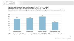 Hasil survei berdasarkan tiga nama menunjukkan bahwa elektabilitas Prabowo Subianto mengalami peningkatan yang cukup signifikan diangka 30.3 % yang sebelumnya pada Februari diangka 26.7%. Sementara itu, Ganjar Pranowo mengalami penurunan sekitar 8.1% yang sebelumnya pada Februari diangka 35% dan Anies Baswedan pun mengalami kenaikan diangka 25.3 % yang sebelumnya pada Februari diangka 24%.