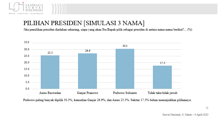 Berdasarkan hasil survei dari Lembaga Survei Indonesia (LSI) pada 31 Maret- 4 April 2023 dengan simulasi 19 nama, terdapat tiga kandidat yang memiliki elektabilitas tertinggi, yaitu Ganjar Pranowo, Prabowo Subianto, dan Anies Baswedan. Namun, tampak terjadi pergeseran yang sangat besar terhadap tiga besar calon presiden Republik Indonesia, yaitu Ganjar Pranowo mengalami kemunduran, Prabowo cenderung menguat, sementara Anies relatif tidak banyak berubah. Pada simulasi 19 nama, Ganjar Pranowo tetap unggul, tetapi elektabilitasnya turun signifikan pada bulan Februari diangka 27.1 % menjadi 19.8% pada bulan April. Survei tersebut dilakukan pada 31 Maret- 4 April 2023, sehingga kemungkinan besar kemerosotan elektabilitas Ganjar Pranowo berkaitan dengan batalnya Indonesia menjadi tuan rumah Piala Dunia U-20. Sementara itu, Prabowo Subianto mengalami kenaikan sekitar 2.2% pada bulan Februari diangka 17.1% menjadi 19.3% pada bulan April. Di samping itu, Anies Baswedan juga mengalami kenaikan 2.2% pada bulan Februari 17.2% menjadi 18.4% pada bulan April.