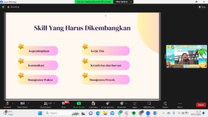 Moderator terlebih dahulu membacakan CV dan memperkenalkan pemateri kepada para peserta, kemudian mempersilakan pemateri untuk memberikan presentasi materi. Pemateri memberikan materi yang sesuai dengan tema acara Talkshow Prestasi 2023. Beliau menjelaskan secara detail materi mengenai skill yang harus dikembangkan di dalam dunia perkuliahan, yaitu terdapat skill kepemimpinan, komunikasi, manajemen waktu, kerja tim, kreativitas dan inovasi, serta manajemen proyek.